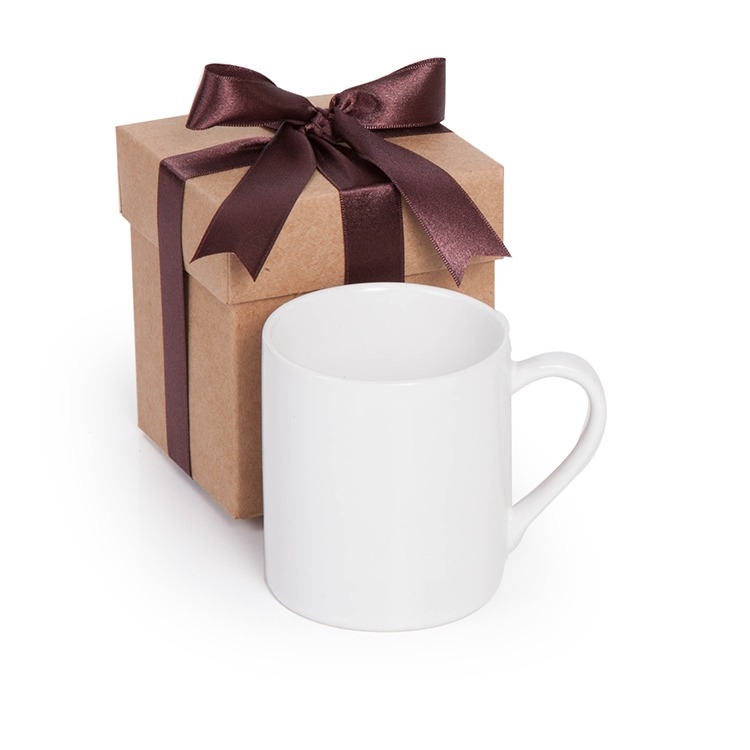1 Caneca reta de porcelana 300ml 9x8cm 1 Caixa corte e vinco em papel cartão KRAFT 400gr com laço de cetim 9.5x10x11.5 /peso 0,430gr