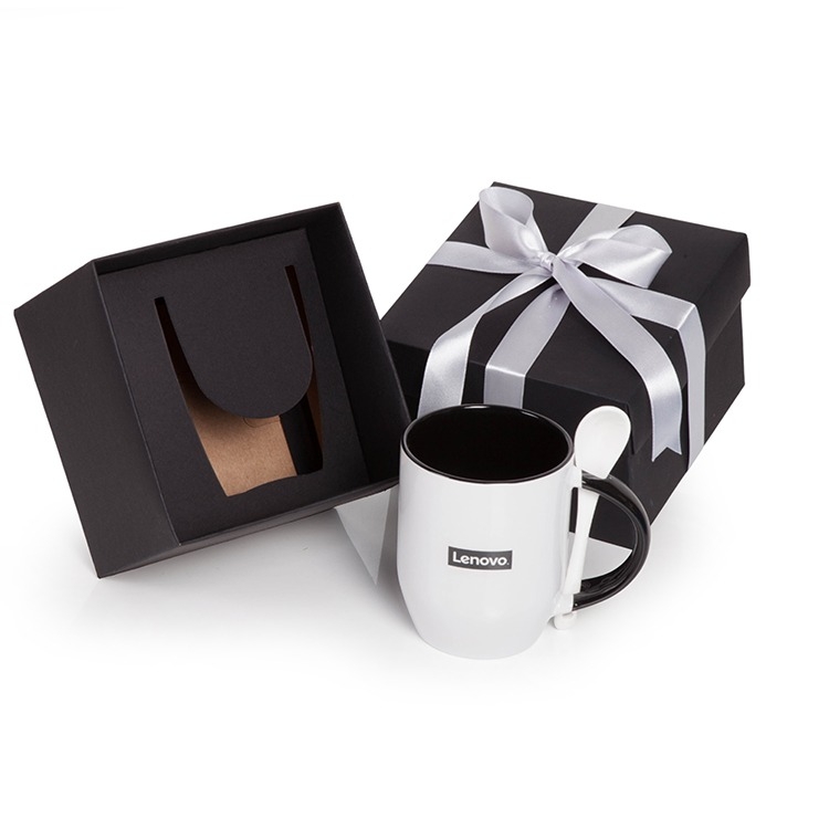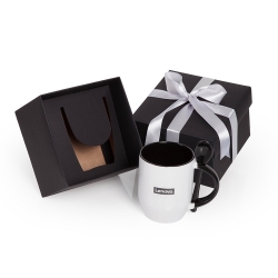 1 Caneca de porcelana base curva 300ml com colher 10cm altura x8 cm de boca 1 Caixa corte e vinco em papel cartão preto fundo 400gr tampa 240gr com laço de cetim 14x14x10cm Peso 450g Personalizamos com sua logomarca, consulte!