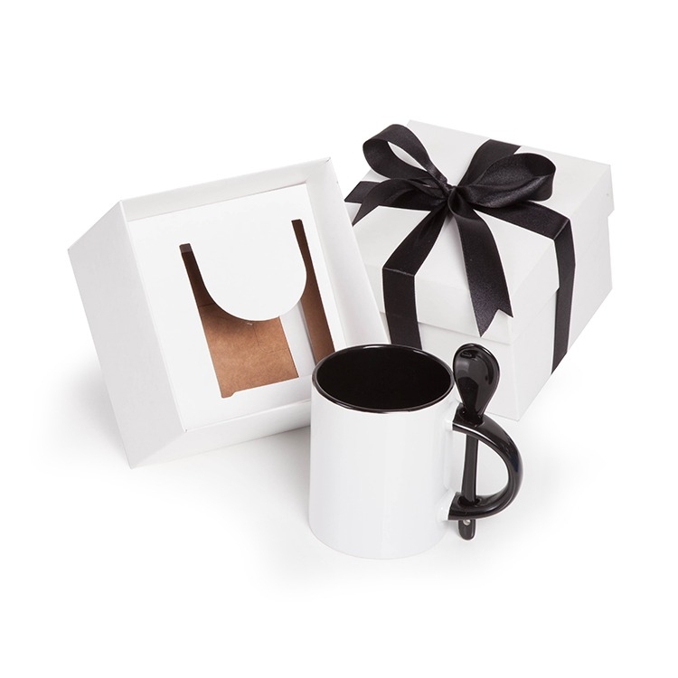 1 Caneca de porcelana base reta 300ml com colher 9.5cm altura x8 cm de boca 1 Caixa corte e vinco em papel cartão branco 360gr com laço de cetim 14x14x10cm Peso 450g Personalizamos com sua logomarca, consulte!
