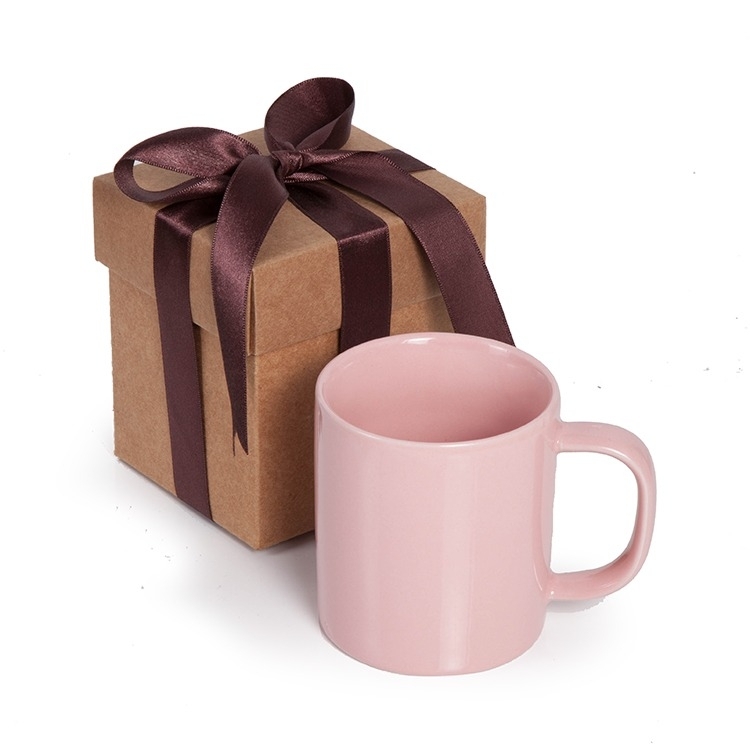 1 Caneca reta de porcelana rosa 300ml 9x8cm 1 Caixa corte e vinco em papel cartão branco 360gr com laço de cetim 9.5x10x11.5 /peso 0,430gr