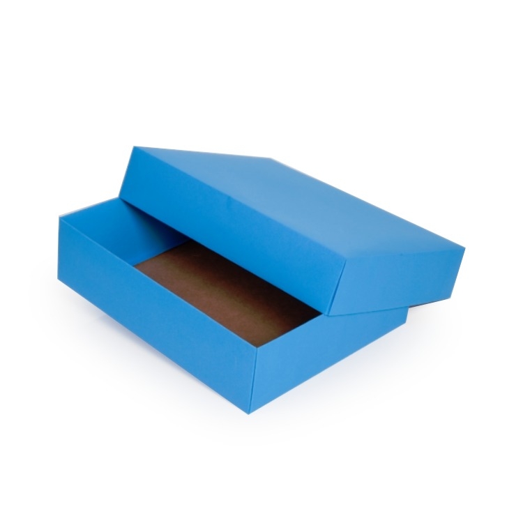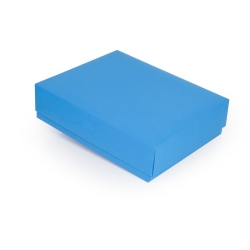 Caixa corte e vinco em papel cartão azul Grécia 400gr 34x28x9cm Tampa com aba larga de 7cm Personalizamos com sua logomarca, consulte! CP48