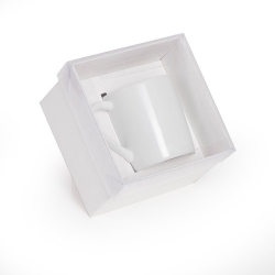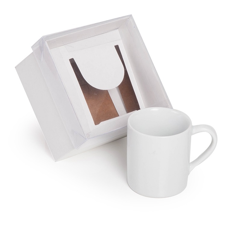 1 Caneca reta de porcelana 300ml 9x8cm 1 Caixa e berço corte e vinco em papel cartão branco 360g tampa transparente 14x14x10cm Peso 450g F74/