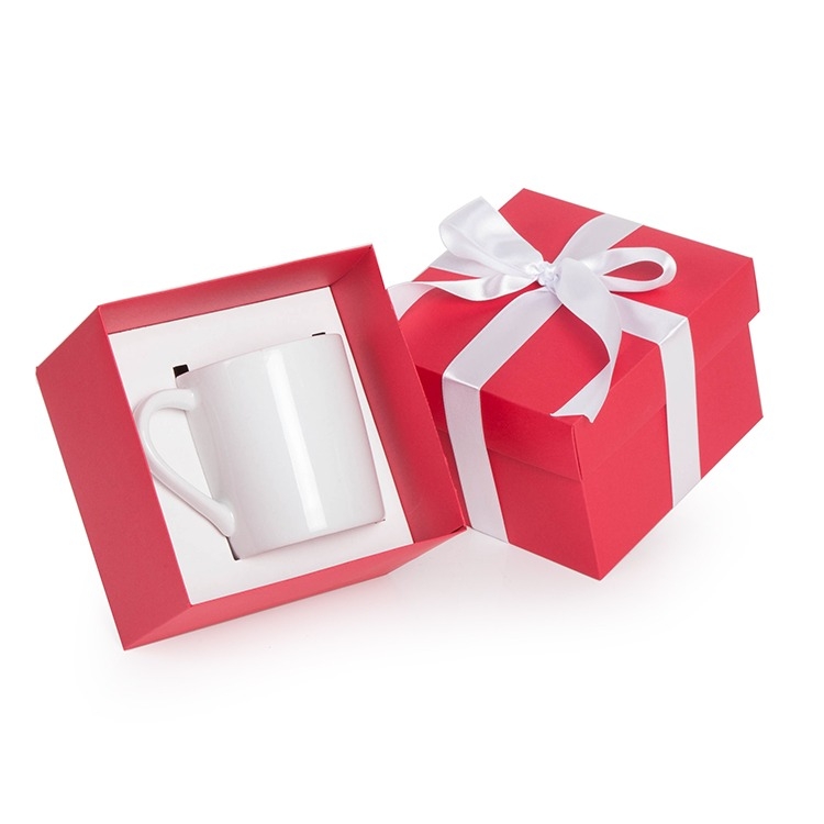 1 Caneca reta de porcelana 280ml 9x8cm 1 Caixa corte e vinco em papel cartão vermelho fundo e berço branco 400gr tampa 200gr com laço de cetim 14x14x10cm Peso 450g