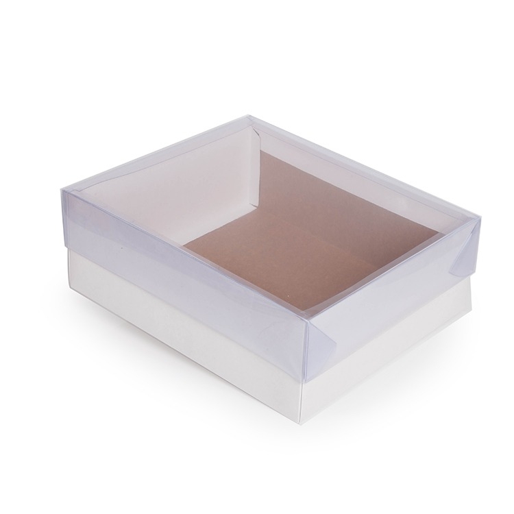 Caixa corte e vinco em papel cartão kraft 400g branca 360g tampa transparente com aba de 7cm 34x28x12cm
