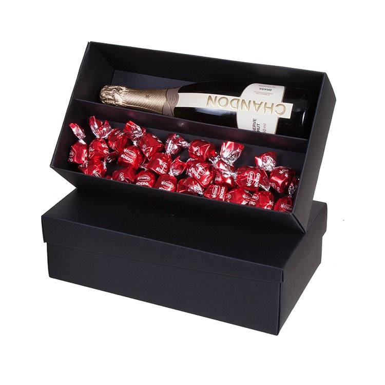 Caixa e divisória corte e vinco em papel cartão preto 400gr 34x19x10cm Foto ilustrativa : não acompanha bebida e bombons.