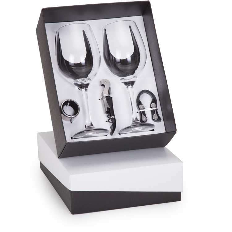2 Taças para vinho de vidro 490ml (7056) 1 Saca rolhas dois estágios 1 Anel salva gotas 1 Cortador de lacre 1 Caixa e berço corte e vinco em papel cartão 400gr 28x22x12cm / Peso 0.790g CP45 B04