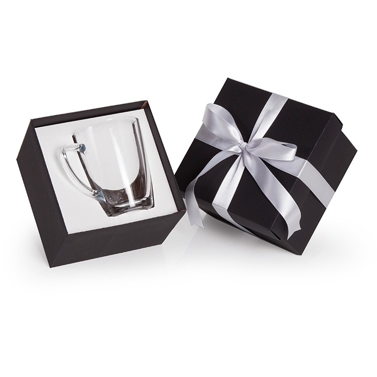 1 Caneca Tarsila de vidro 300ml (5921) 11 x 7,8 x 10,5 cm 1 Caixa e berço corte e vinco em papel cartão preto fundo e berço 400gr tampa 200gr 14x14x10cm / Peso 0.405g F539