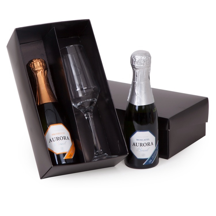 1 Espumante Aurora Boreal 187ml Opções : Prosecco ou Moscatel 1 Taça Buffet de vidro para Champagne 186ml 1 Caixa e divisoria corte e vinco em papel cartão preto 400gr / 200gr 23.5x13x7cm / peso 0.730g Personalizamos com sua logomarca, consute ! F168/168B/50/246 aurora1