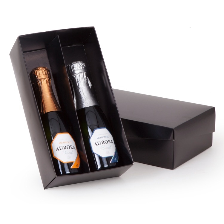 1 Espumante Prosecco Aurora Boreal 187ml 1 Espumante Moscatel Aurora 187ml 1 Caixa e divisória corte e vinco em papel cartão preto 400gr 23.5x13x7cm / peso 0.830g Personalizamos com sua logomarca, consulte ! F168/168B/50/246
