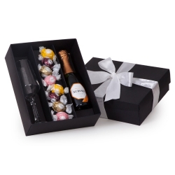 1 Espumante Aurora Boreal 187ml Opções : Prosecco ou Moscatel 1 Taça Buffet de vidro para Champagne 186ml 8 Bombons Montevergine 1 Caixa corte e vinco em papel cartão preto 400gr 24x19.5x7cm / peso 0.950g