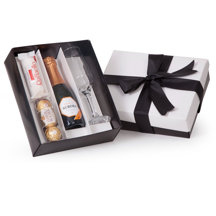 1 Espumante Aurora Boreal 187ml Opções : Prosecco ou Moscatel 1 Taça de vidro 186ml 3 Unid Bombons Ferrero Rocher 3 Unid Bombons Raffaello 1 Caixa corte e vinco em papel cartão preto e branco 275gr 24x19.5x7cm / peso 0.890g Personalizamos com sua logomarca, consulte! aurorabombom auroraferrero