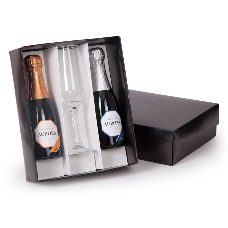 1 Espumante Aurora Moscatel Boreal 187ml 1 Espumante Aurora Prosecco Boreal 187ml 1 Taça Buffet de vidro para Champagne 186ml 1 Caixa e divisória corte e vinco em papel cartão 275gr 24x19.5x7cm / peso 1.150g F169/169B/49/246