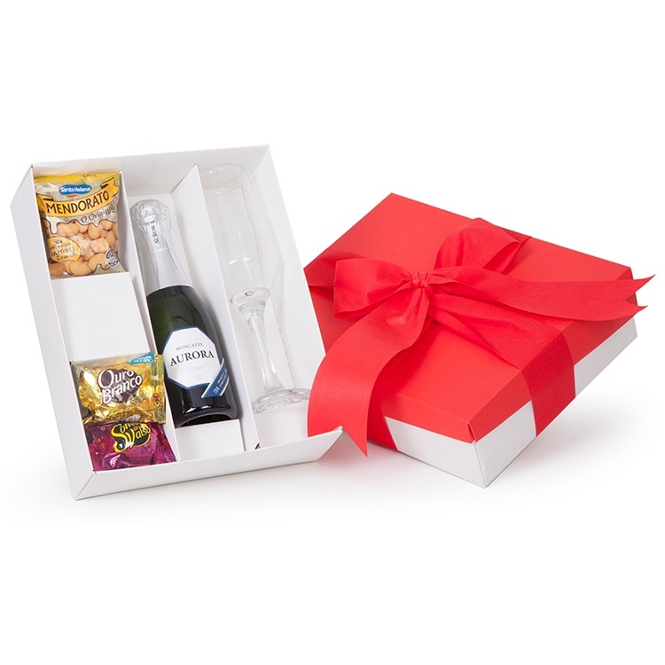 1 Espumante Aurora Boreal 187ml Opções : Prosecco ou Moscatel 1 Taça Buffet de vidro para Champanhe 186ml 1 Bombom Ouro Branco 1 Bombom Sonho de Valsa 1 Pcte Amendoim Mendorato 27g 1 Caixa e berço corte e vinco em papel cartão 275gr 24x19.5x7cm / Peso0,880g F169/169B/49