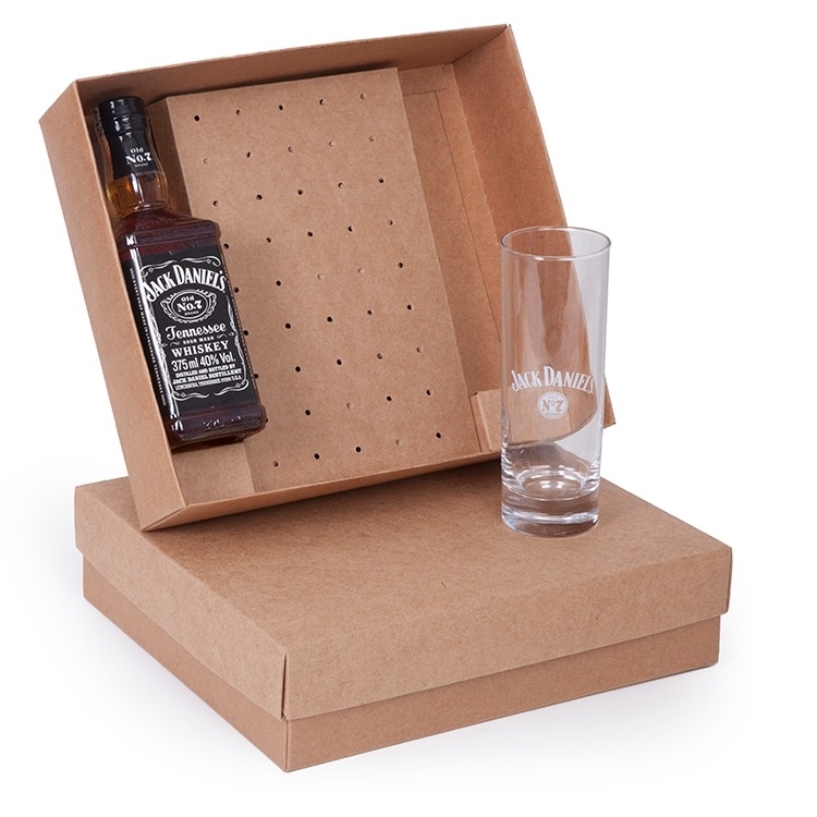 Caixa corte e vinco em papel cartão FSC certificado 400gr 27X24X7CM 1 Berço corte e vinco em papel cartão FSC multiuso 14.8x23.5 para fixação de peças com elástico. Espaço para : 1 Copo de vidro tubo Atol 300ml 1 Whiskey Jack Daniel´s 375ml OBS: NÃO ACOMPANHA WHISKY E COPO