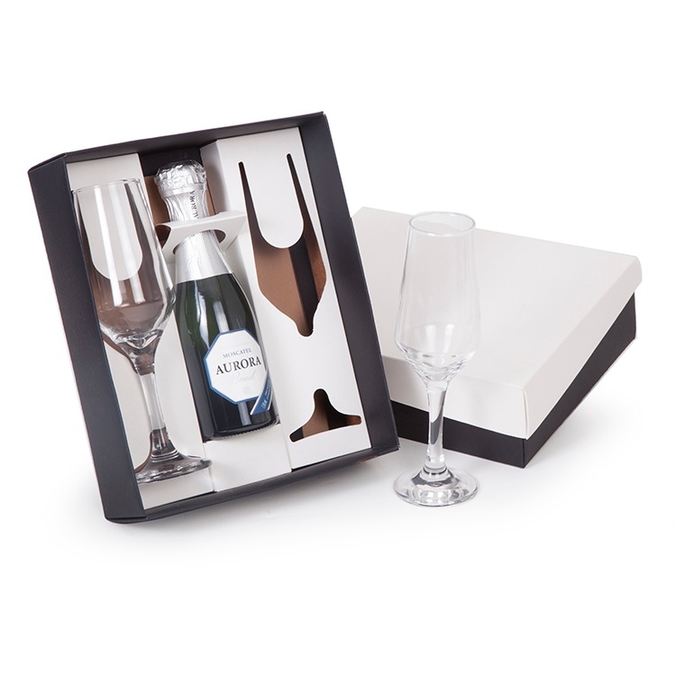 1 Espumante Moscatel Aurora Boreal 187ml 2 Taças Buffet de vidro para Champagne 186ml 1 Caixa e berço corte e vinco em papel cartão preto e kraft ou preto e branco 400gr 24x19.5x7cm / peso 0.950g F169/169B/49/246 aurora2