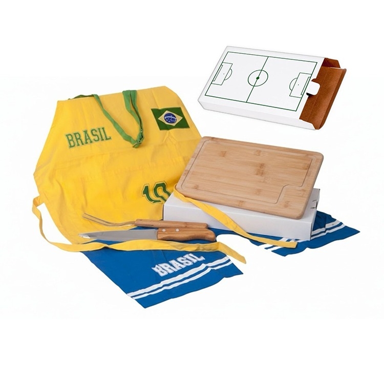 1 Faca de Aço inox com cabo de bambu 1 Garfo de Aço inox com cabo de bambu 1 Tábua de bambu 32x20x1.2cm 1 Avental Churrasqueiro Brasil 100% algodão 87x60cm 1 Caixa corte e vinco em papel cartão kraft Peso 1.160g / 21x4.5x34cm F257 EST 155