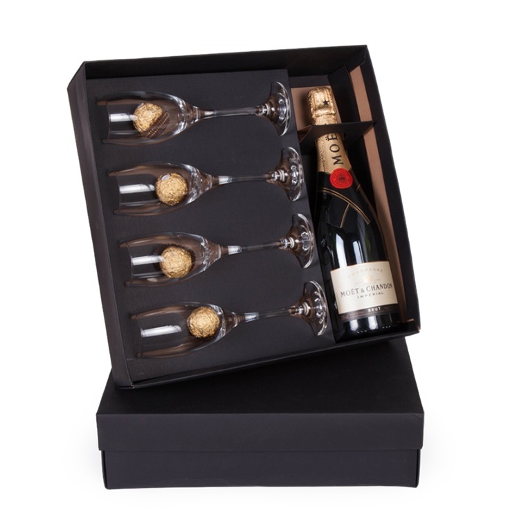 Champagne Moët & Chandon Imperial brut 750ml 4 Taças de vidro Barone para champagne 190ml (7856) 4 Bombons Ferrero Rocher Caixa e berço corte e vinco em papel cartão 400gr Peso 2.750g / 35x35x10cm CP49/B52