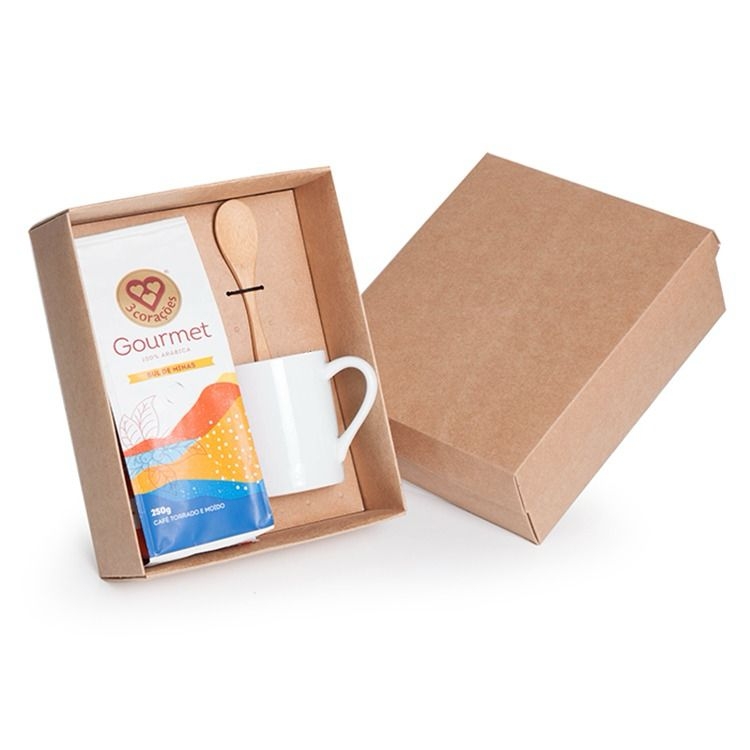 Caixa corte e vinco em papel cartão kraft 360g 24x19.5x11.5cm (foto ilustrativa) não acompanha elástico, café, colher e caneca. F169C/T281