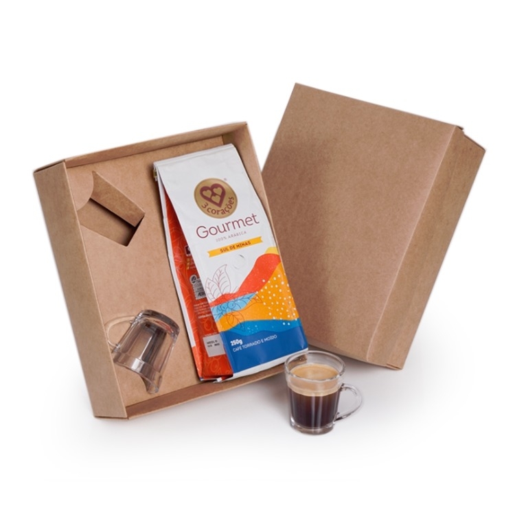 Caixa corte e vinco em papel cartão kraft 360g 24x19.5x8.5cm Berço desenvolvido para Xicaras Café americano vidro 90ml (5110) 7,5 x 5,7 x 6,8 cm (foto ilustrativa) não acompanha café e xicaras F169E/T281