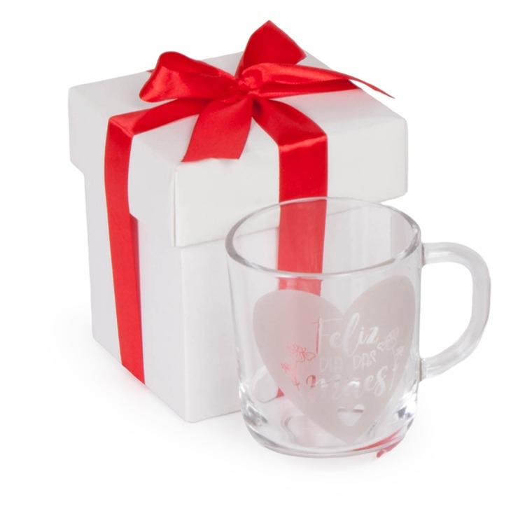 1 Caneca de vidro Aspen 300ml (5909) 11 x 8 x 8,9 cm 1 Caixa corte e vinco em papel cartão branco 360gr e laço Personalizamos com sua logomarca, consulte! 9.5x10x11.5cm / Peso 330g F174b T174