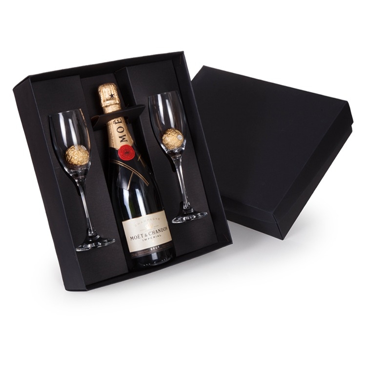 1 Champagne Moët & Chandon brut 750ml 2 Taças de vidro Barone para champagne 190ml (7856) 2 Bombons Ferrero Rocher 1 Caixa e berço corte e vinco em papel cartão 100% Black 34x28x9cm / peso 2.430g