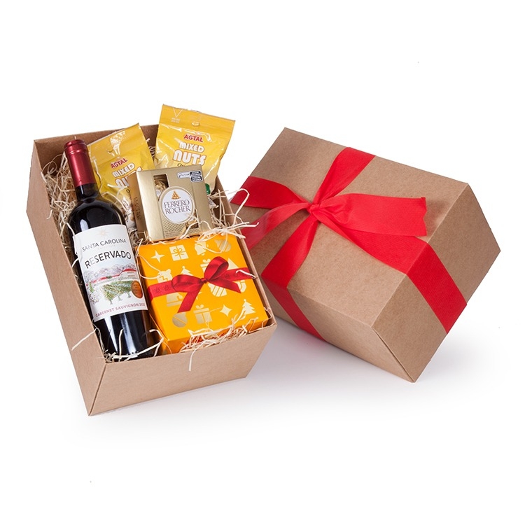 1 Vinho Chileno Santa Carolina Reservado Cabernet Sauvignon tinto 750ml 1 Ferrero Rocher 4 unidades 1 Panetone Bauducco frutas 400g 2 Mixed Nuts 50g 1 Caixa corte e vinco em papel cartão kraft 400gr com laço de TNT ou Cetim Peso 2.300kg 23Lx33Cx16.5A cm Cestadenatal