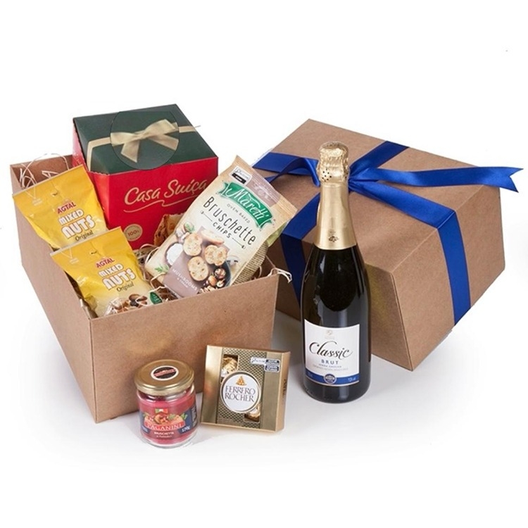 1 Espumante Salton Classic brut 750ml 1 Bruschette Chips Maretti 85g 1 Antepasto Bruschetta ai Pomodori Paganini 170gr 1 Panetone Casa Suiça frutas 400g 2 Mixed Nuts 50g 1 Caixa corte e vinco em papel cartão kraft 400gr com laço de TNT ou Cetim Peso 3.200kg 23Lx33Cx16.5A cm Cestadenatal