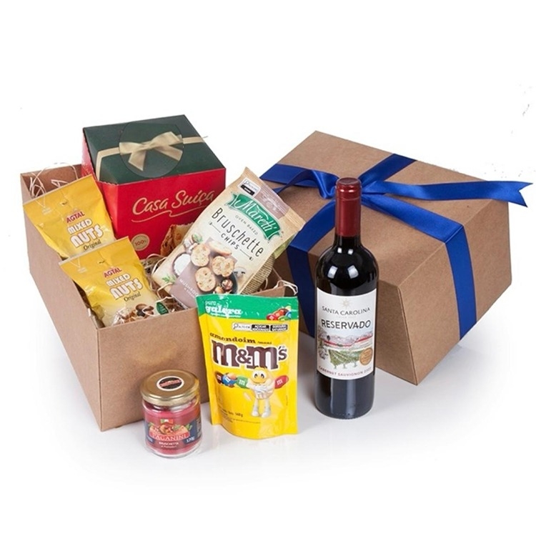1 Vinho Chileno Santa Carolina Reservado Cabernet Sauvignon tinto 750ml 1 M&M´S Amendoim 148g 1 Bruschette Chips Maretti 85g 1 Antepasto Bruschetta ai Pomodori Paganini 170gr 1 Panetone Casa Suiça frutas 400g 2 Mixed Nuts 50g 1 Caixa corte e vinco em papel cartão kraft 400gr com laço de TNT ou Cetim Peso 2.800kg 23Lx33Cx16.5A cm Cestadenatal
