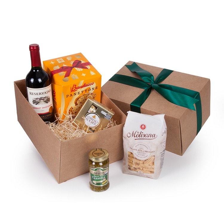 1 Vinho Chileno Concha Y Toro Reservado Cabernet Sauvignon 750ml 1 Pasta Italiana La molisana 500gr 1 Molho Italiano ao Pesto Filippo Berio 190gr 1 Ferrero Rocher 4 unidades 1 Panetone Bauducco frutas 400g 1 Caixa corte e vinco em papel cartão kraft 400gr com laço de cetim ou tnt Peso 3.100kg 23Lx33Cx16.5A cm Cestadenatal