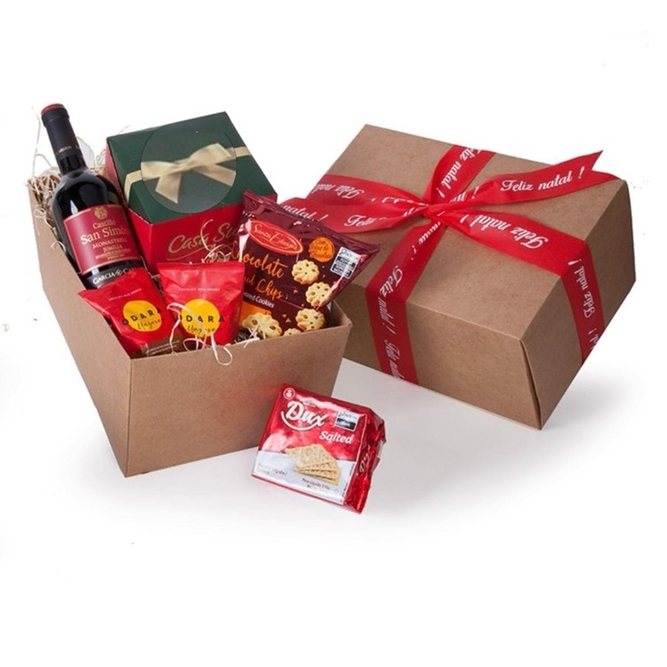 1 Vinho Espanhol Castillo San Simon D.O.P Monastrell Jumilla tinto 750ml 1 Pcte Biscoitos Salgados Dux 110g 2 Alfajores Odara 65g 1 Cookies Santa Edwiges 90g 1 Panetone Casa Suiça frutas 400g 1 Caixa corte e vinco em papel cartão kraft 400gr com laço de cetim ou tnt Peso 2.600kg 23Lx33Cx16.5A cm Cestadenatal