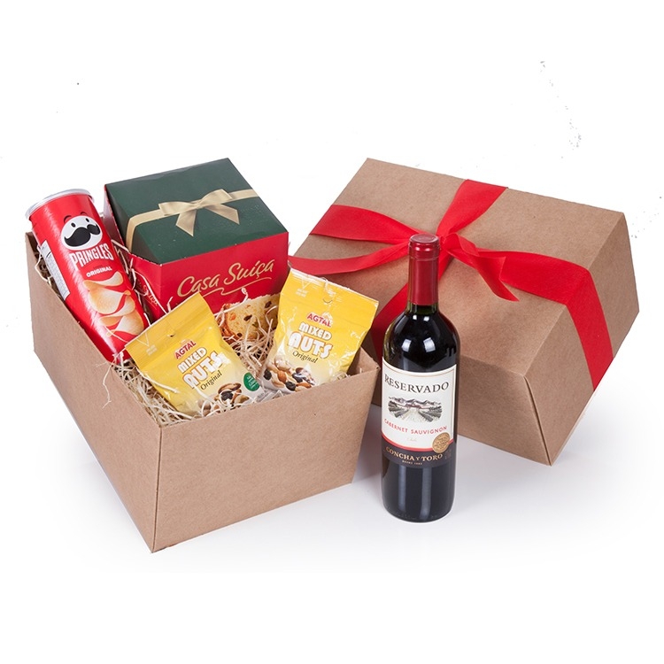 1 Vinho Chileno Concha Y Toro Reservado Cabernet Sauvignon 750ml 1 Panetone Casa Suiça frutas 400g 1 Pringles 100g 2 Mixed Nuts 50g 1 Caixa corte e vinco em papel cartão kraft 400gr com laço de TNT Peso 2.400kg 23Lx33Cx16.5A cm Cestadenatal