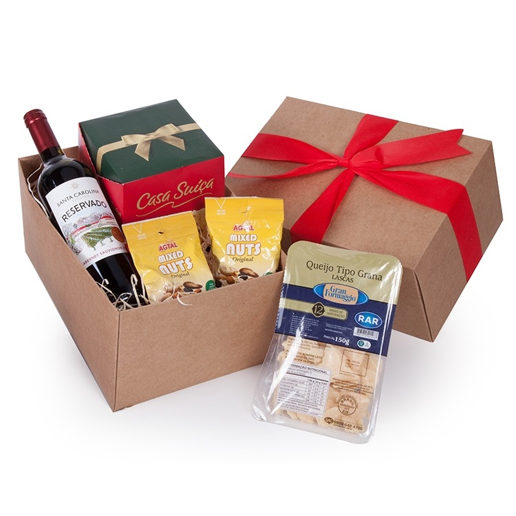 1 Vinho Chileno Santa Carolina Reservado Cabernet Sauvignon tinto 750ml 1 Queijo Tipo Grana em Lascas 150g 1 Panetone Casa Suiça frutas 400g 2 Mixed Nuts 50g 1 Caixa corte e vinco em papel cartão kraft 400gr com laço de TNT Peso 2.400kg 23Lx33Cx16.5A cm Cestadenatal
