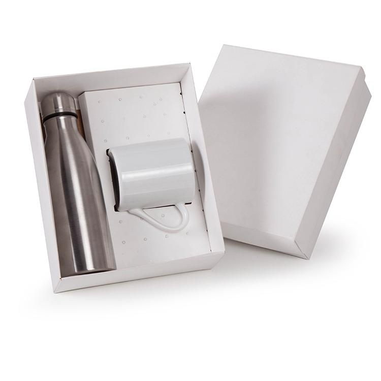 Caixa e berço corte e vinco em papel cartão branco 360gr 28x22x10cm Berço desenvolvido para garrafa 23x7cm caneca 9x8cm (foto ilustrativa) não acompanha garrafa e caneca T282/FD45