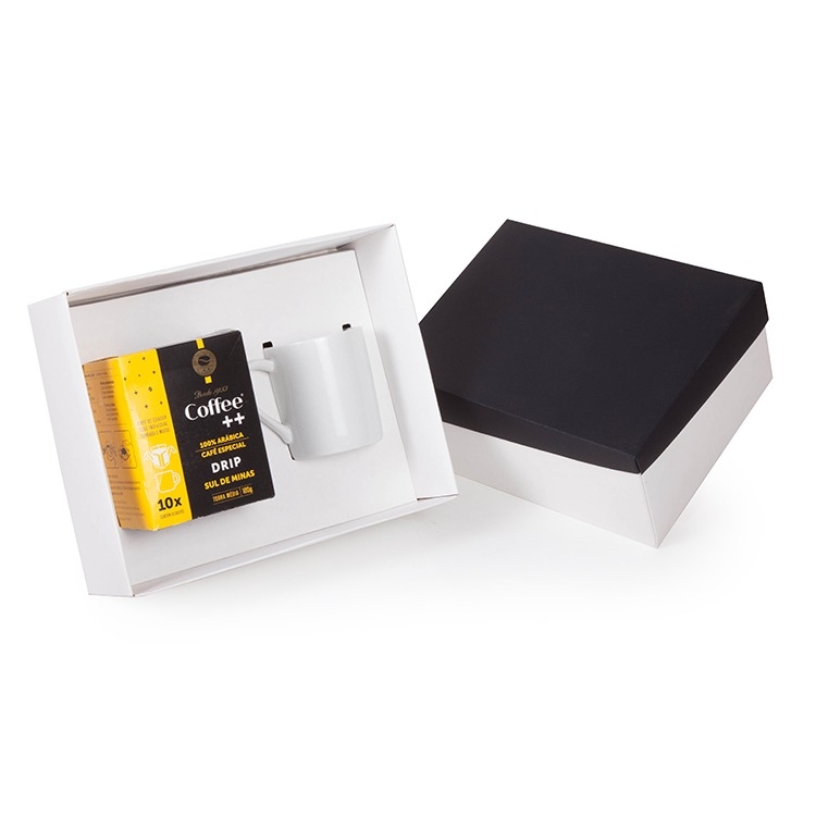 1 Caixa e berço corte e vinco em papel cartão fundo e berço branco 360gr tampa preta 400gr 28x22x10cm Foto ilustrativa não acompanha café e caneca berço ideal para : 1 Drip Coffee Sul de Minas Coffee 10 sachês 100g medidas 10x10x12.5cm 1 Caneca reta de porcelana 280ml 9x8cm F45 F45