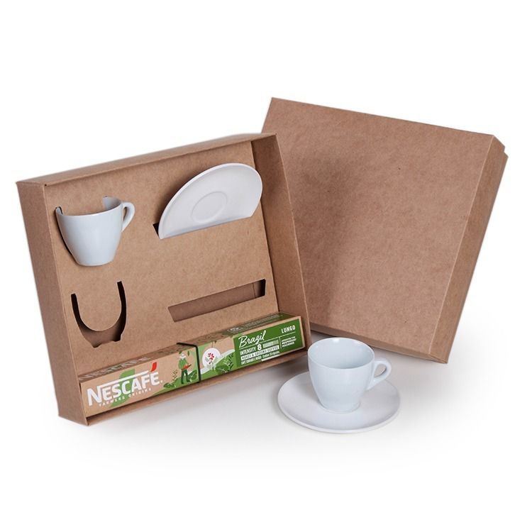 Caixa e berço corte e vinco em papel cartão Kraft 420gr 28.5X24X7CM Foto ilustrativa não acompanha xicaras, pires e café, desenvolvida para 2 Xicaras de porcelana para café 95ml com 6.5cm boca , 3.5cm fundo, 6cm altura cm e 2 Pires de porcelana 12.5cm Personalizamos com sua logomarca, consulte! F266b T 266 B512 Belolar 3303