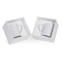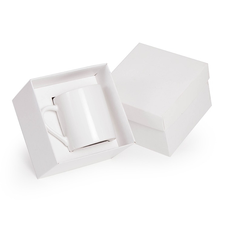 1 Caneca reta de porcelana 280ml 9x8cm 1 Caixa e berço corte e vinco em papel cartão kraft 400g ou branca 360gr 14x14x10cm Peso 450g 259c/259/74
