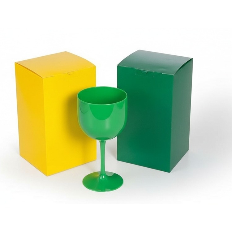 1 Taça de acrilico verde para gin 580ml 1 Caixa em papel cartão corte e vinco na cor verde ou amarela 200gr Personalizamos com sua logomarca, consulte! 12x13x22.5cm / Peso 0150gr F98