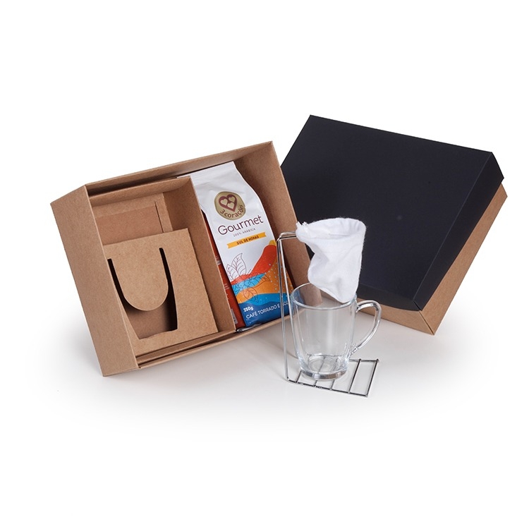 1 Café Gourmet 100% Arabica 3 Corações 250g 1 Porta coador mini cromado 1 Caneca Tarsila de vidro 300ml (5921) 11 x 7,8 x 10,5 cm 1 Caixa corte e vinco em papel cartão kraft 400gr tampa 200gr 28x22x10cm Peso 0.950kg F45