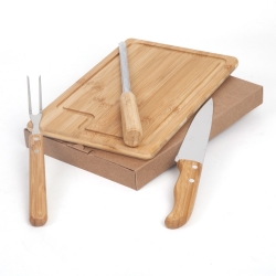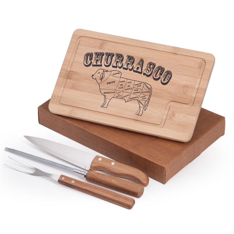 1 Tábua de bambu 32x20x1.2cm 1 Faca de Aço inox com cabo de bambu 1 Garfo de Aço inox com cabo de bambu 1 Chaira de Aço inox com cabo de bambu 1 Caixa corte e vinco em papel cartão kraft 300gr 34x21.5x5cm / Peso 0.970g F257