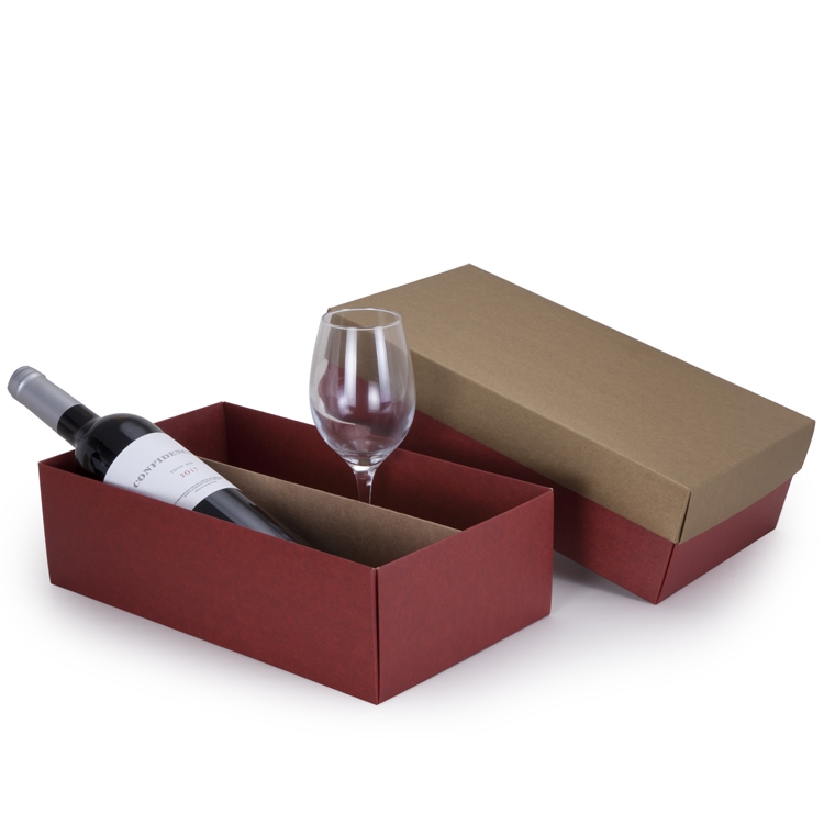 Caixa corte e vinco em papel cartão vermelho tampa dourada, berço em kraft 400gr 34X19X10cm foto ilustrativa não acompanha bebida e taças CPVD