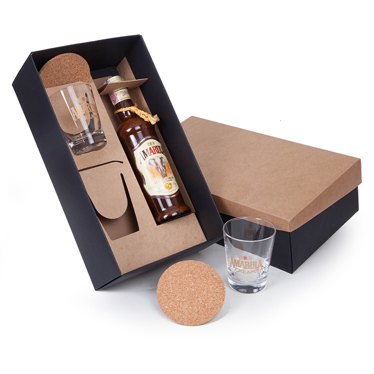 1 Licor Africano Amarula 375ml 2 Copos de vidro 220ml 2 Porta copos de cortiça 1 Caixa e berço corte e vinco em papel cartão 34x19x10cm / Peso 1.500g Personalizamos com sua logomarca, consulte!
