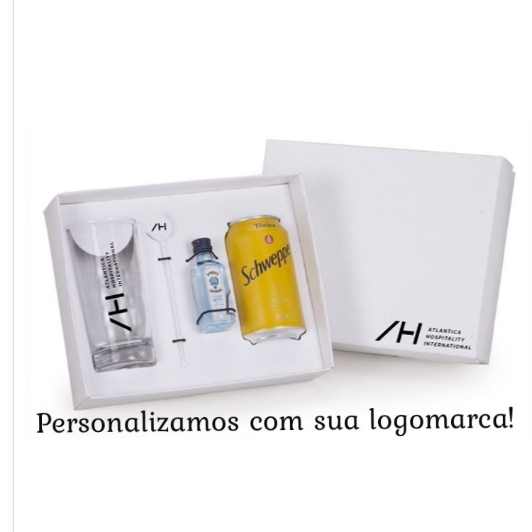 1 Gin Bombay 50ml 1 Tônica Schweppes 350ml 1 Mexedor 1 Copo de vidro cylinder 350ml (7600) 1 Caixa e berço corte e vinco em papel cartão 24x19.5x7cm / Peso 0,990g