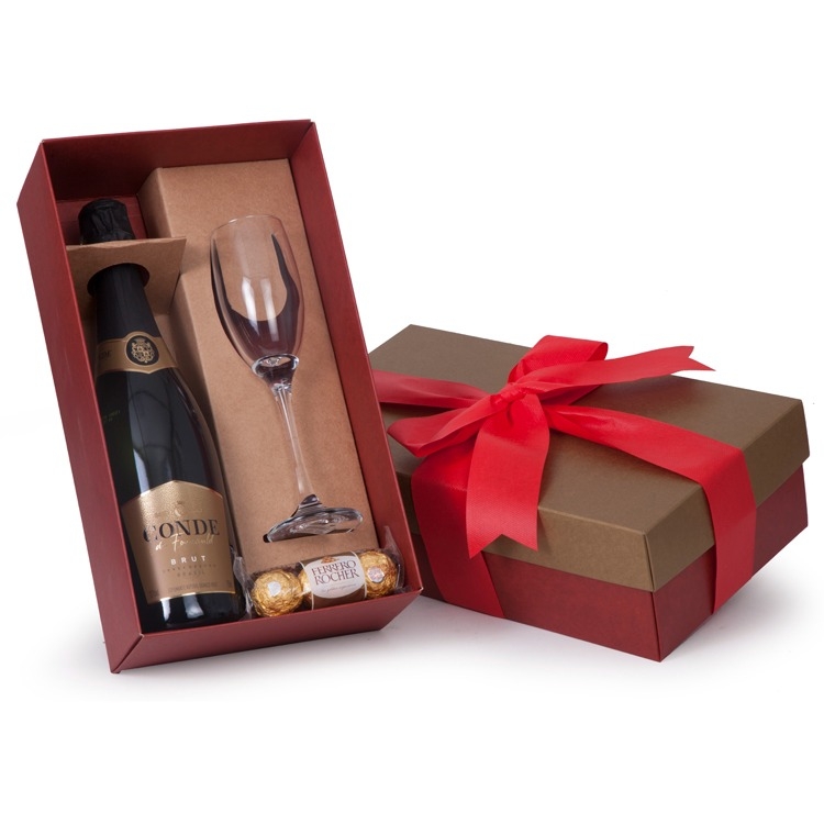 1 Espumante Conde de Foucauld Brut 750ml 1 Taça Barone de vidro 190 ml (7856) 3 unid Bombons Ferrero Rocher 1 Caixa corte e vinco em papel cartão vermelho e dourado com laço 34x19x10cm / Peso 1.960g
