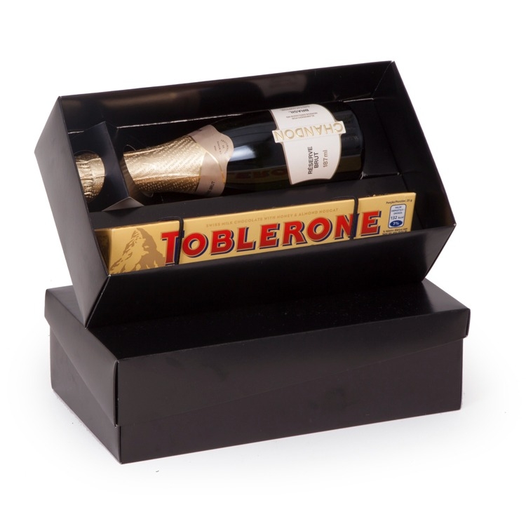 1 Caixa e berço corte e vinco em papel cartão preto 400gr / tampa 200gr 23.5x13x7cm Berço desenvolvido para espumante de 187ml (foto ilustrativa) não acompanha chocolate e bebida. B213 F168B T284