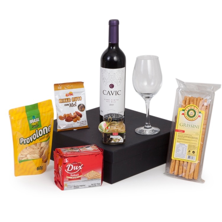 1 Vinho Argentino Cavic Mendoza tinto 750ml 1 Taça de vidro para vinho 385ml 1 Snack Provolone 60g 1 Brusqueta Italiana Gourmet La Pastina 140g 1 Pcte Biscoitos Salgados Dux 110g 1 Pcte Grissini 120gr 1 Mixed Nuts 50g 1 Caixa corte e vinco em papel cartão 400gr 35x35x10cm / peso 2.450kg F 267A/ T 267