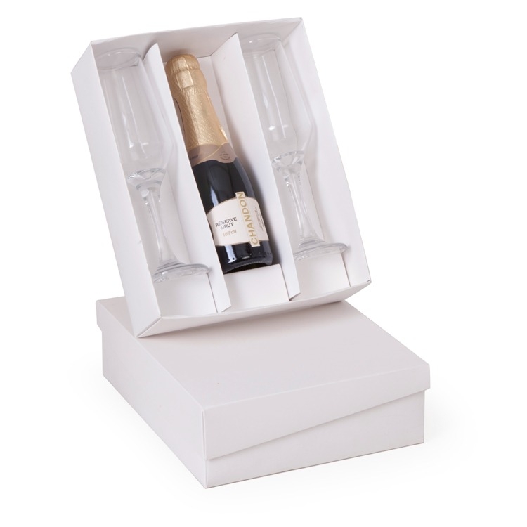 1 Caixa e divisoria corte e vinco em papel cartão branco 360g 24x19.5x7cm Caixa para espumante de 187ml (foto ilustrativa) não acompanha bebidas e taça cp22se baby02SE