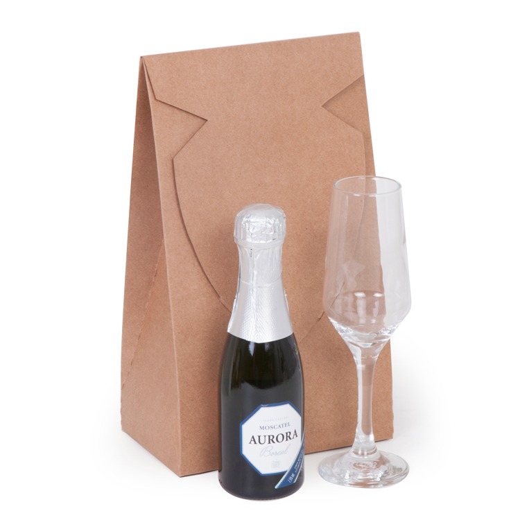 1 Espumante Aurora Boreal 187ml Opções : Prosecco ou Moscatel 1 Taça Buffet de vidro para Champagne 186ml 1 Caixa corte e vinco em papel cartão FSC certificado 400gr Disponível também na cor branca 10x16.5x28.5 cm / Peso 0.690gr F111 aurora1