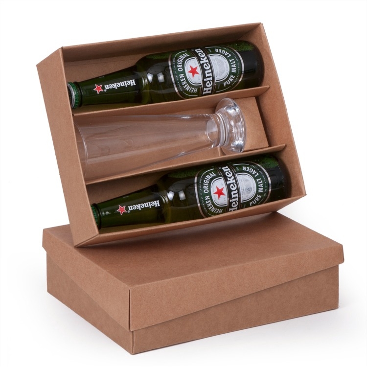 2 Gfas de cerveja Heineken 250ml 1 Tulipa de vidro 300ml 1 Caixa e divisoria corte e vinco em papel cartão kraft 300gr 24x19.5x7cm / Peso 1.500g