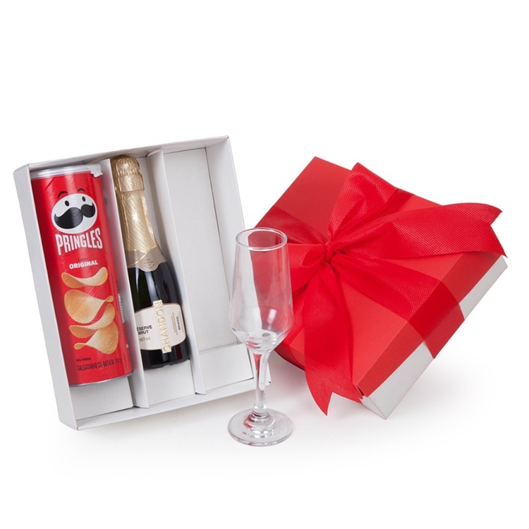 1 Espumante Chandon Reserve 187ml 1 Taça Buffet de vidro para Champanhe 186ml 1 Tubo Batata Pringles 100g 1 Caixa e divisória corte e vinco em papel cartão branco 300gr 24x19.5x7cm / Peso 0.900g F169/169B/49