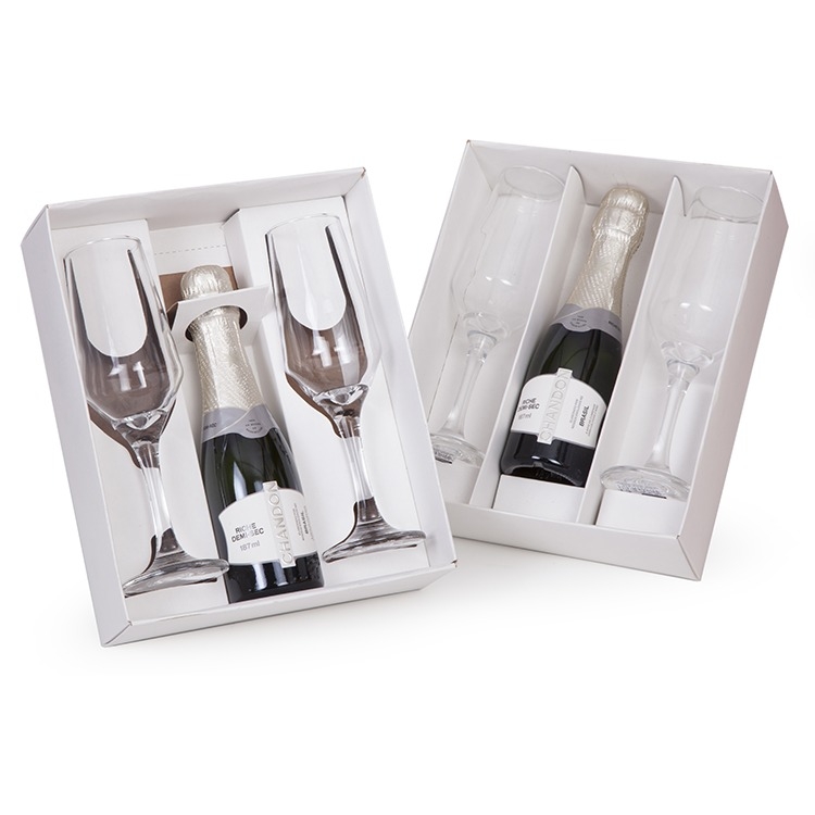 1 Caixa e berço corte e vinco em papel cartão branco 360gr 24x19.5x7cm Berço desenvolvido para espumante de 187ml e taça 186ml SM Buffet Nadir (foto ilustrativa) não acompanha bebidas e taças cp22se baby02SE